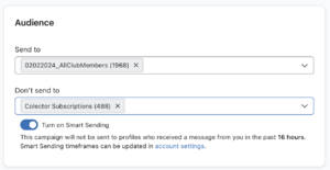 • Smart Sending: To avoid sending recipients too many emails at once, turn on Smart Sending to skip profiles who have recently received an email from your account.